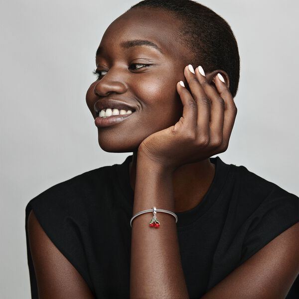 Add this cherry charm to your look for a vibrant pop of colour. Crafted in sterling silver, this fruity dangle charm features a pair of ripe red cherries with detailed green leaves hand-finished in transparent enamel. Wear it alone or style it with other fruit charms to turn your favourite Pandora pieces into a medley of delectable, collectable sweet summer fruits.